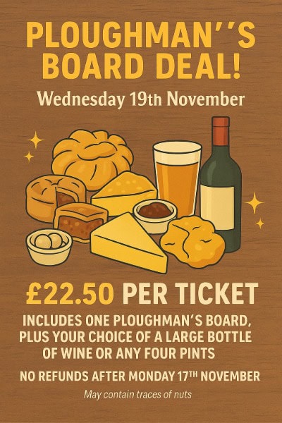 For just £22.50, secure your ticket and savour the choice of either a large bottle of wine or any four refreshing pints. But that’s not all – prepare to be enchanted by a delightful Ploughman’s board meticulously crafted by a local buffet business!