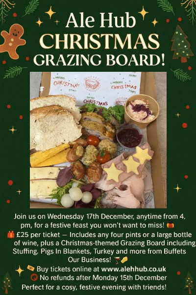 π Β£25 per ticket β includes any four pints or a large bottle of wine PLUS a Christmas-themed grazing board featuring Stuffing, Pigs in Blankets, Turkey & more from Buffets Our Business!