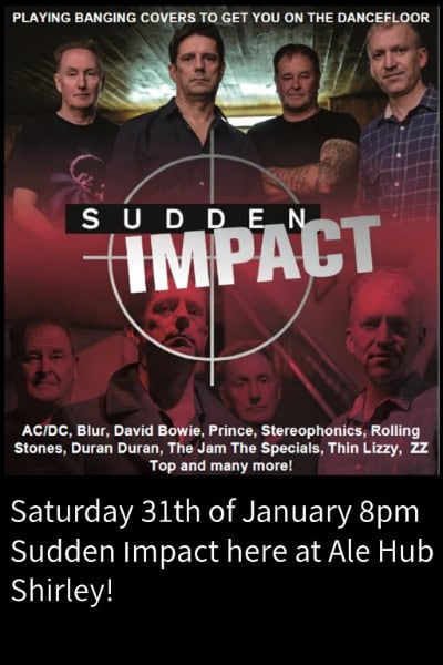 🔥 LIVE MUSIC ALERT 🔥 Sudden Impact land at Ale Hub Shirley on Saturday 31st January, 8PM Banging covers from AC/DC, Bowie, Blur, Prince, The Stones & more — guaranteed to get you on the dancefloor!