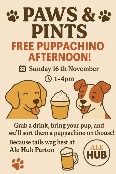 Paws & Pints: Free Puppachino Afternoon! ๐พ Join us on Sunday 16th November, 1โ4pm for a treat-filled afternoon for you and your furry friend! ๐ Buy a drink and your pooch gets a free puppachino! Because good dogs deserve good vibes. ๐บโ