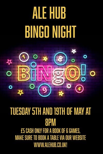🎉 Eyes down… it’s BINGO time! 🎉 Join us at Ale Hub for Bingo Night this May – prizes, laughs, and great vibes guaranteed! 🗓 5th & 19th May | ⏰ 8PM 💷 £5 for 6 games – book your table now!